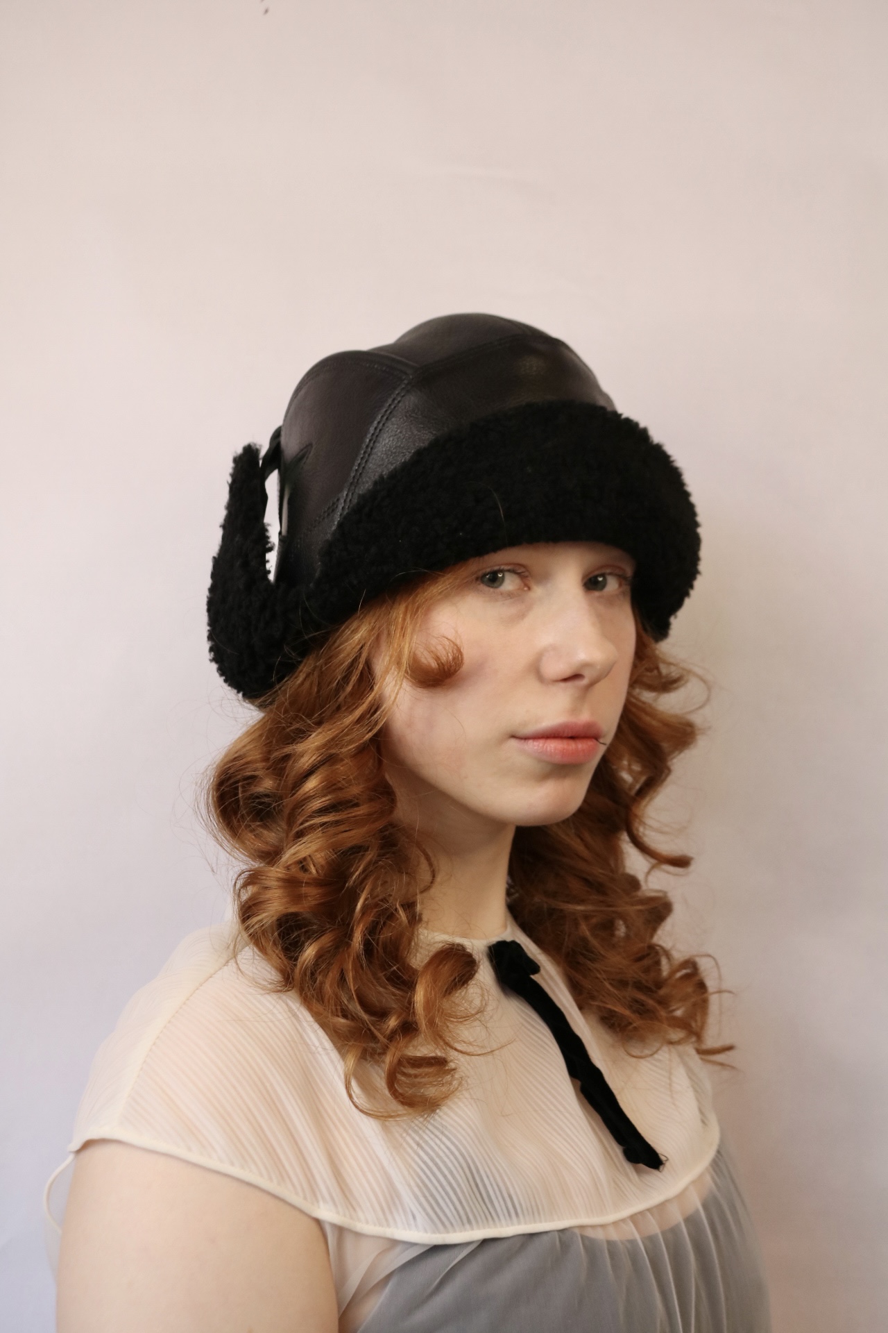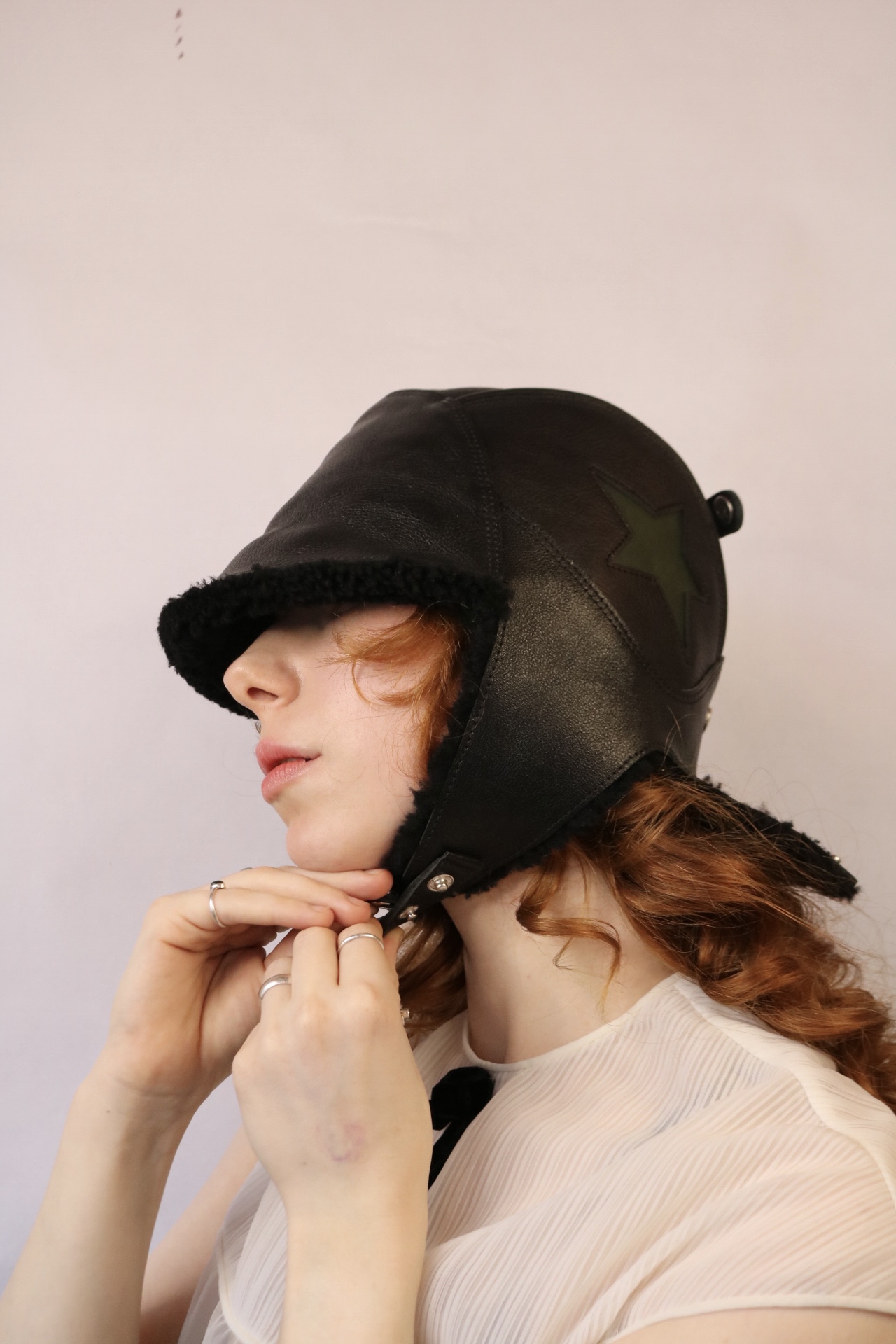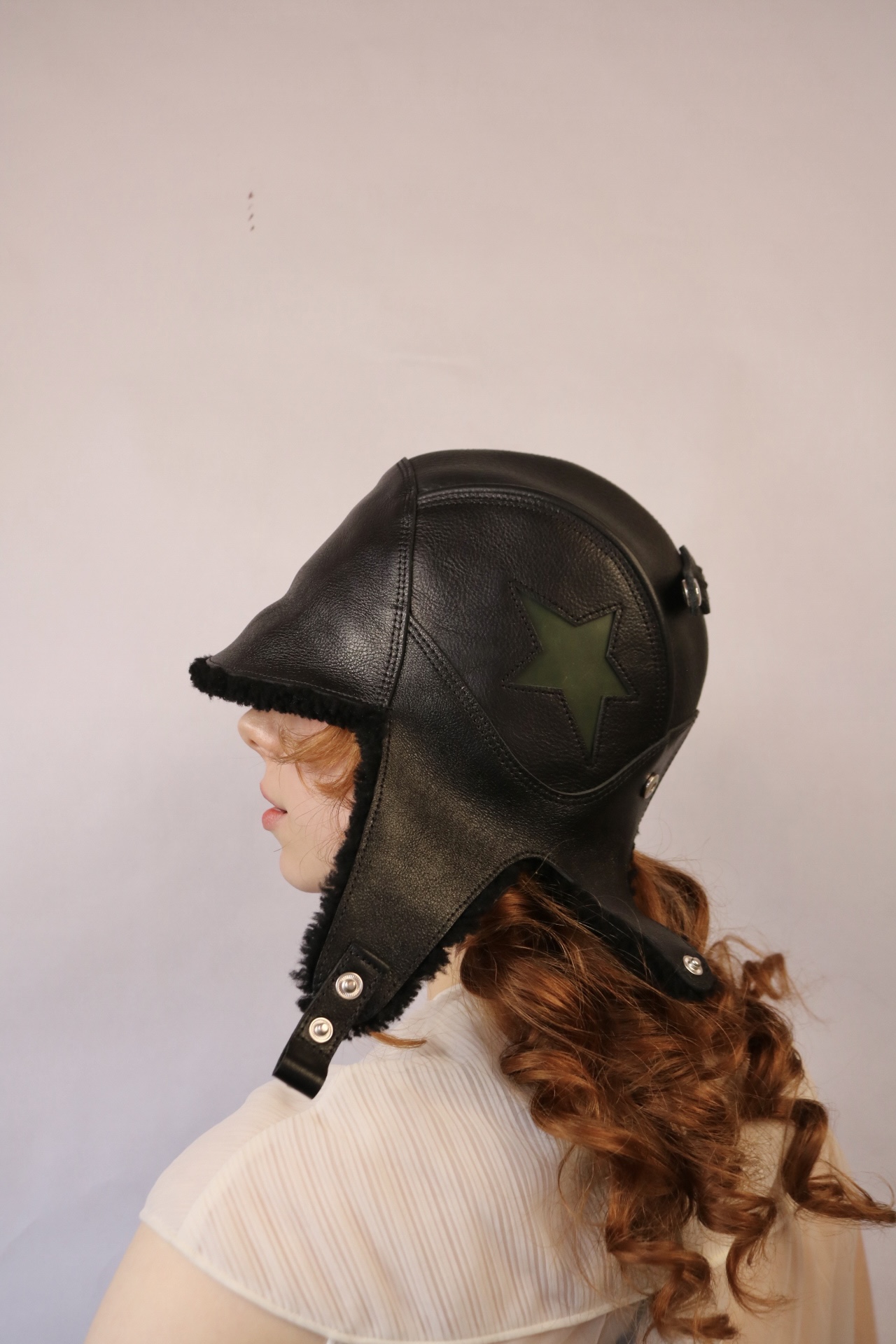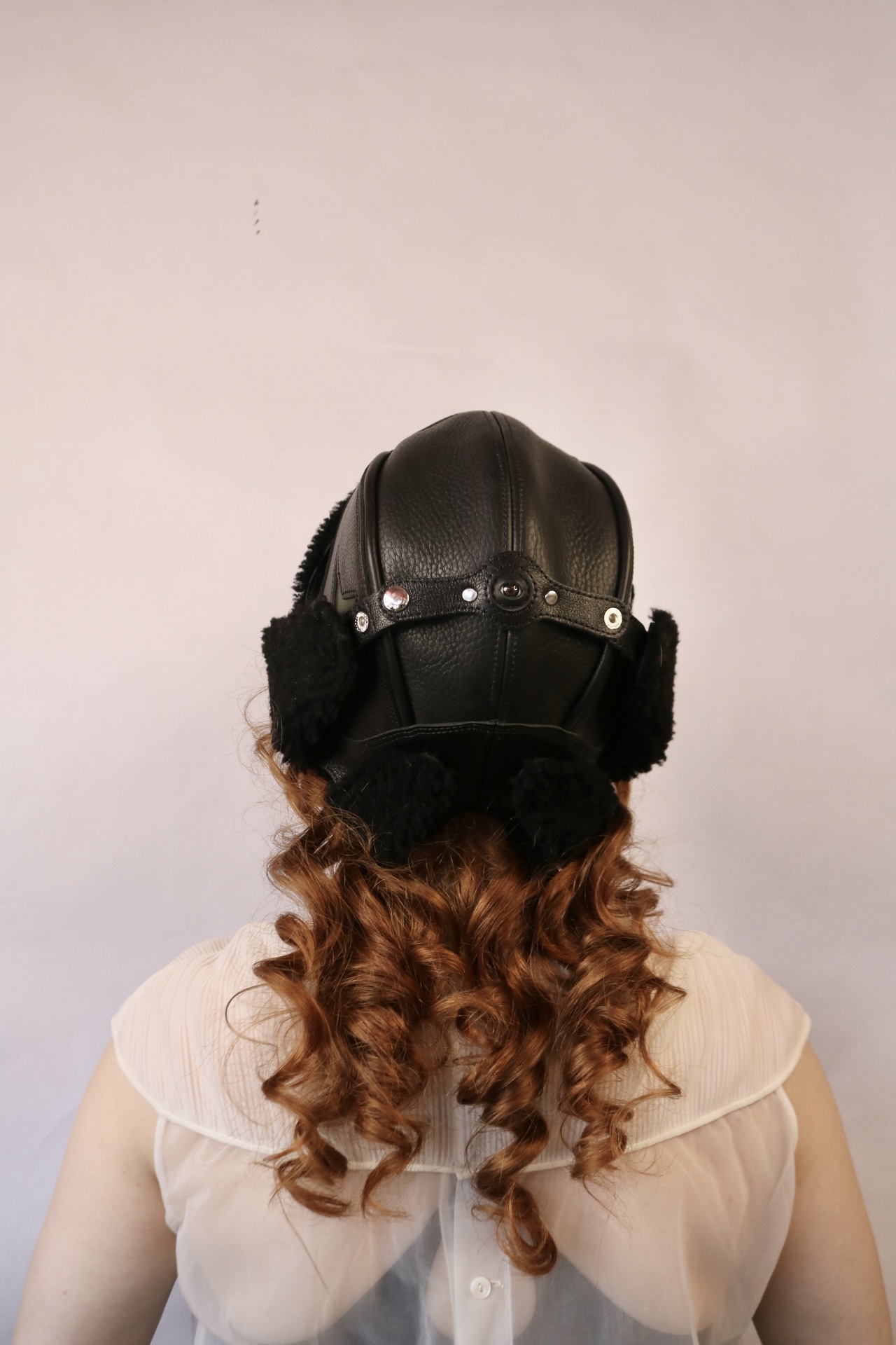Size 22”-22.50” Made with deadstock leather, a deconstructed jacket, and sheep fur for the lining, designed and hand-sewn to create a unique helmet for the wearer. Side panels can snap under the chin and on top to an eye attachment.