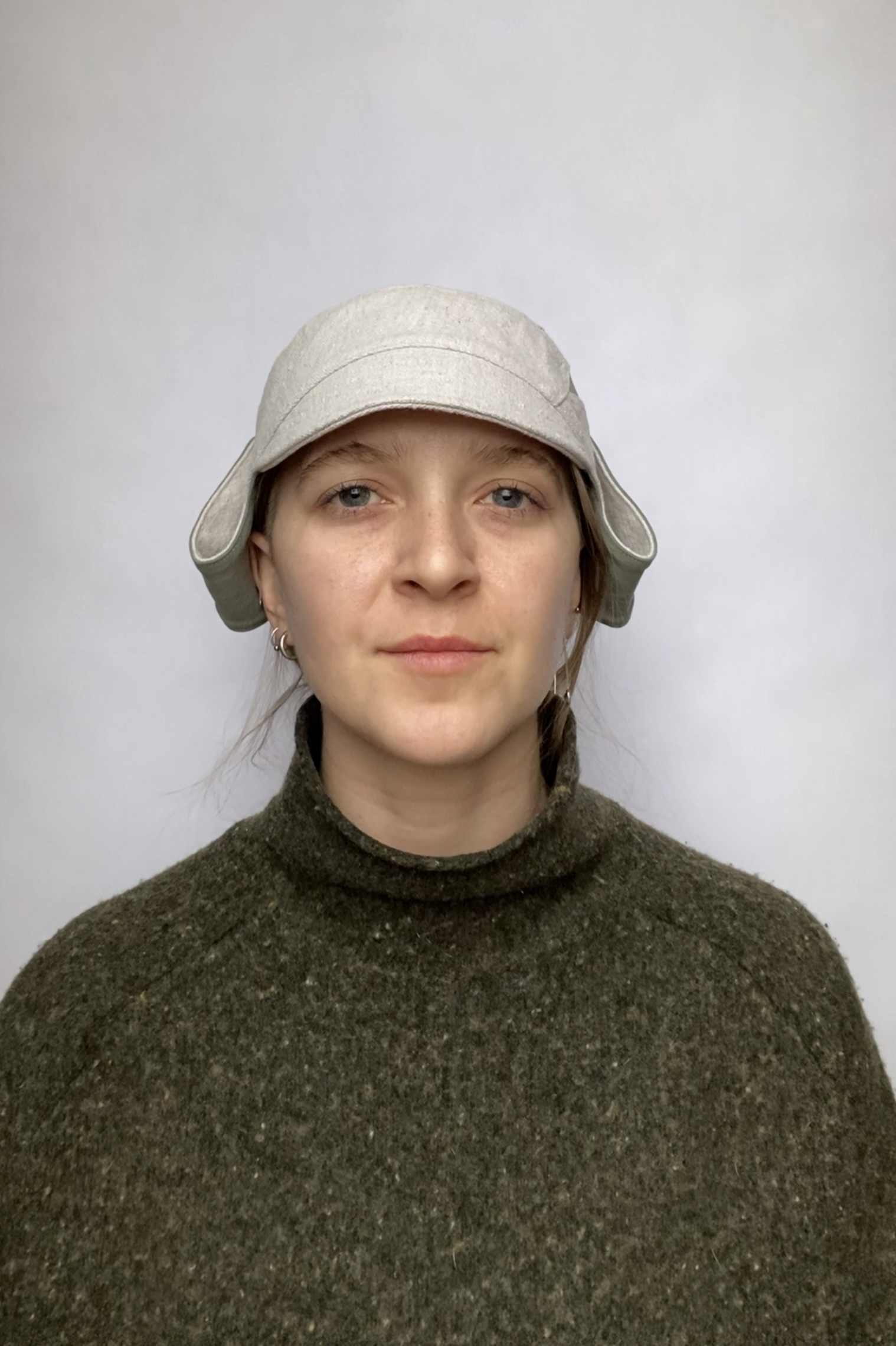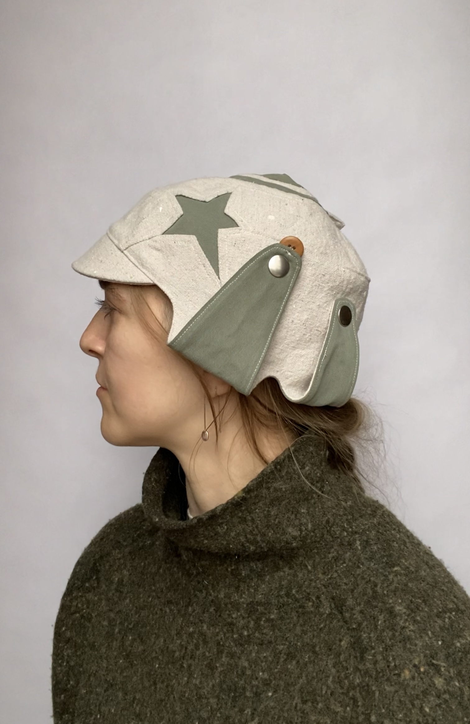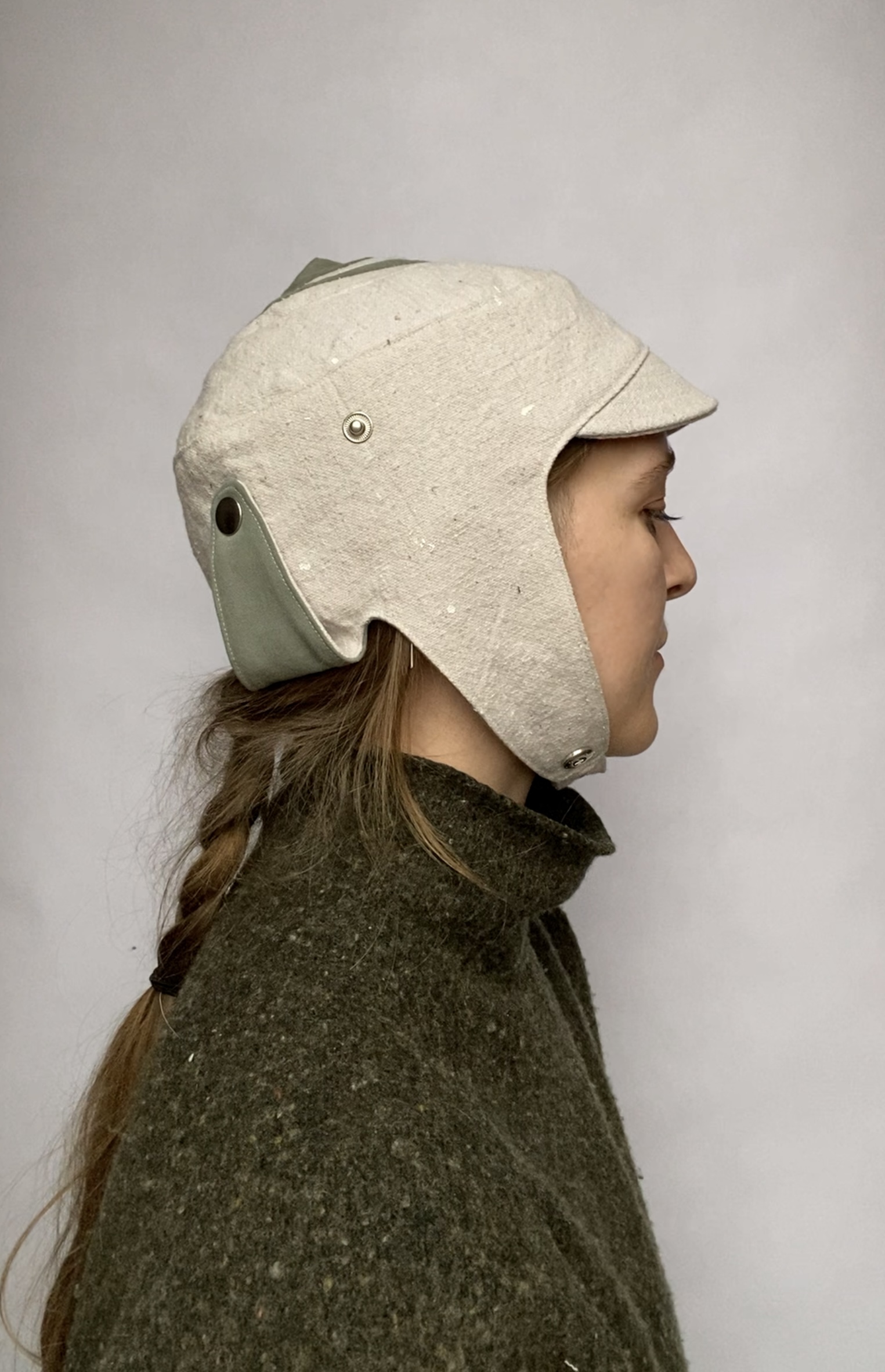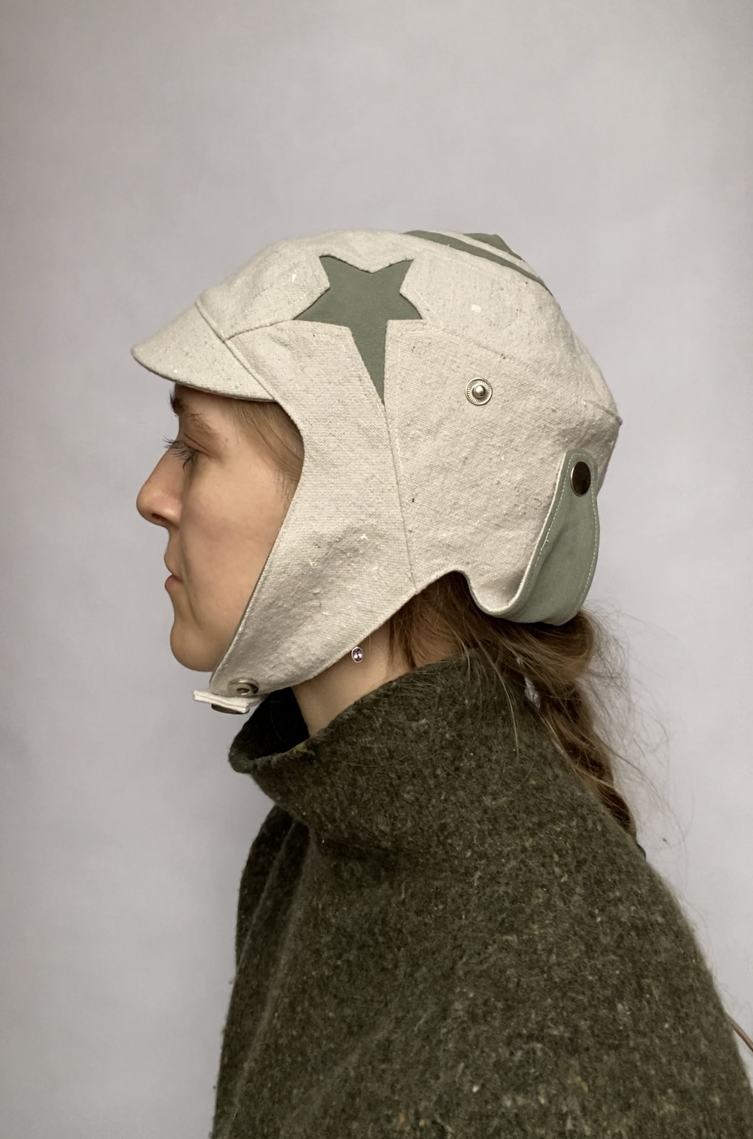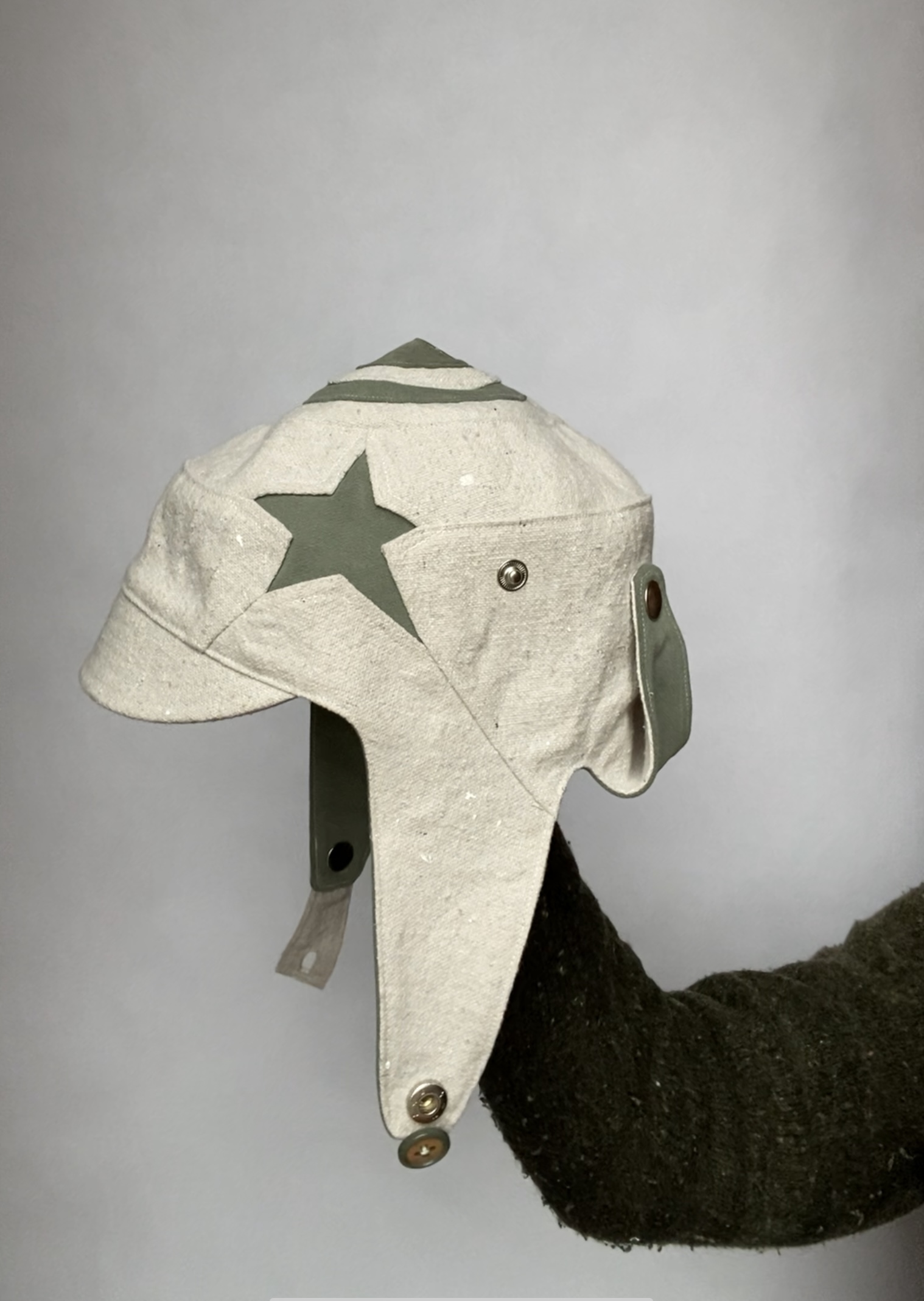 For chin snap closure measure under your ear lobe to ear lobe if this measurement is 8’’ and under this hat will close. Made with an up-cycled painters drop-cloth, a deconstructed garment for the lining. It was designed and sewn to create a unique helmet for the wearer. All of the up-cycled materials are layered to create a new story and have a new life. Side panels can snap under the chin and on the sides of the hat.