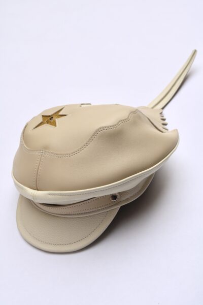 Size 22.50”-22.75” Made with scrap, deadstock leather and up cycled mens dress shirts for the lining. This hat will wear with you over time and adjust to your head. It was designed and hand-sewn to create a unique cap for the wearer. Inspired by a horseshoe crab found in Road Island on the beach. While doing research on the construction of biker caps and military hats I combined that with the Alien horseshoe crab. I would like to think that they are archive uniforms from an underground water collective who teamed up with horseshoe crabs to protect all things ocean in 3010.
